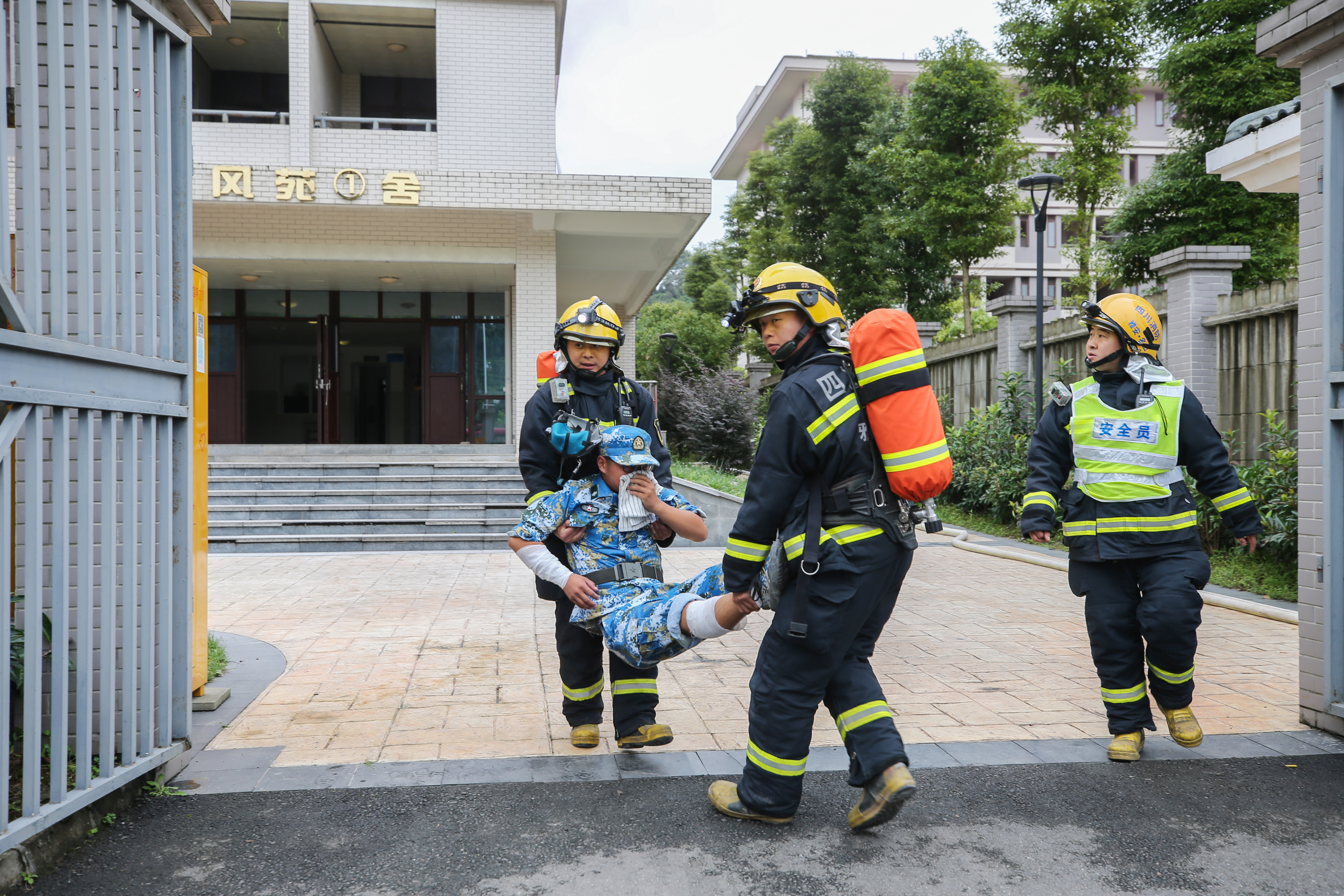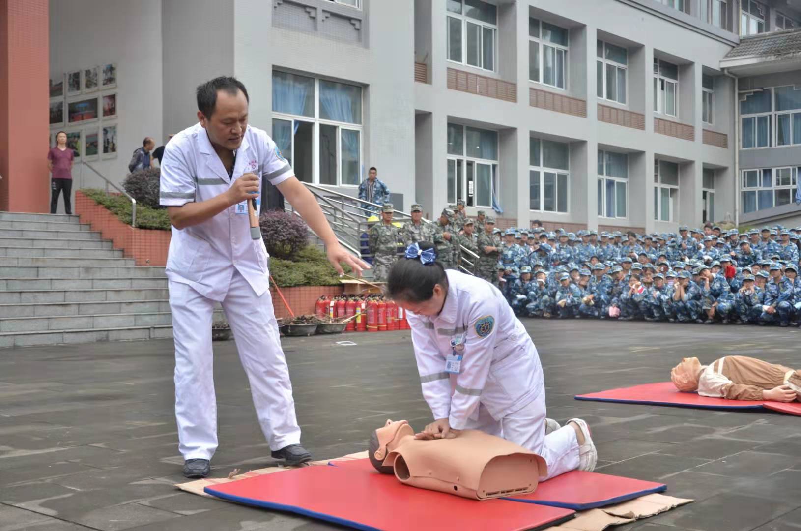 疏散演练结束后,由学院附属医院的医生为新生讲解了急救常识心肺复苏的步骤,并进行了现场演示。随后雅安市消防支队的消防官兵现场为新生进行了消防知识培训,主要讲解了电气火灾的知识防范,发生火灾时如何报警、如何扑灭初级火灾、自救逃生的方法、熟悉疏散路线、ABC干粉灭火器、消火栓的使用方法及学习穿戴专业消防战斗服、并向学生展示了消防特勤器材。