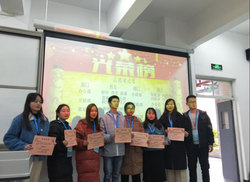 各部门新干事代表分别就本部门工作进行了总结和查漏补缺,随后青志协主席夏康凌通过一系列数据展现了本学期志愿者们参与活动多、基数大、涉及广、服务长的累累硕果,鼓励大家在新的一年里多思考、多创新,再接再厉,再创佳绩。张晓惜老师对本学期志愿服务中表现优异的志愿者进行了表彰,为他们颁发了“志愿者之星”、“ 十佳志愿者”、“ 优秀志愿者模范”荣誉证书。大会最后,张晓惜老师以习近平总书记在2019年的新年贺词“我们都在努力奔跑,我们都是追梦人”与同学们共勉,鼓励志愿者们在新的一年找准定位,勇敢追求自己的梦想,用奋斗和奉献书写无悔青春。