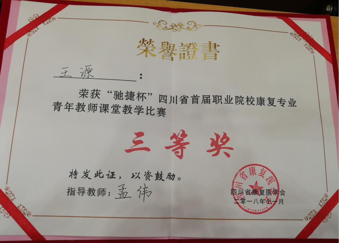 【本网讯】11月23日,我院康复治疗技术专业教师王源参加了四川省首届职业院校青年教师课堂教学比赛,并获得三等奖,孟伟老师获得优秀指导教师奖。