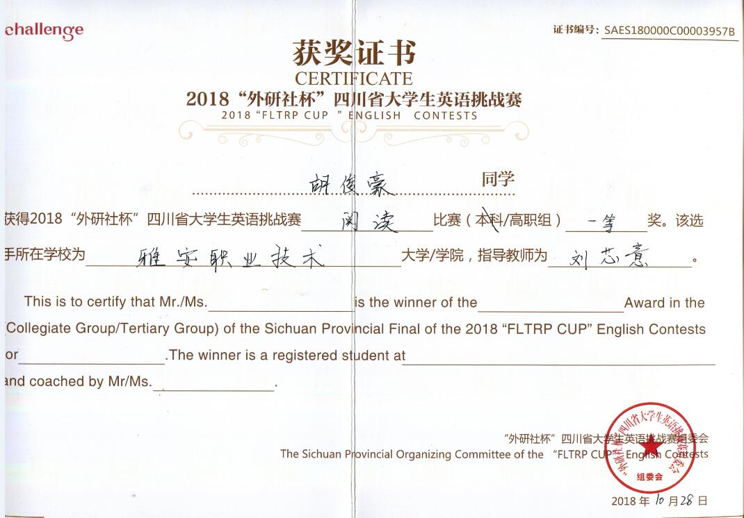 2018年四川省大学生英语挑战赛(UChallenge)(四川省大学生英语演讲大赛、英语写作大赛和英语阅读大赛)是由四川省教育厅主办,西南交通大学、外语教学与研究出版社承办的三项英语赛事。吸引了四川省各大高校的学生积极报名参赛。大赛分为本科组和高职高专组两个组别进行评选,其中阅读、写作比赛为现场机考,演讲比赛由定题演讲、即兴演讲和问题作答构成。我院学生积极参与此项赛事,提高了学生学习英语的积极性及英语专业应用能力,增强了学生的跨文化交际意识,开拓其国际视野,提升其国际素养。