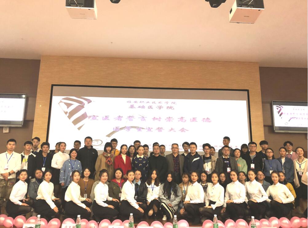 【本网讯】健康所系,性命相托。10月25日,由临床医学院主办,基础医学院协办的“宣医者誓言,树崇高医德”医学生宣誓大会在我院青年路校区实验实训楼二多多功能厅举行。基础医学院党支部副书记张翅、临床医学院党总支副书记李敏、临床医学院副院长庞嘉言、内科教研室主任马宜龙、基础医学院团总支书记赵武博、临床医学院团总支副书记张晓惜、基础医学院教师周卫敏出席大会,临床医学院学生会及各团支部代表共计300余人参加大会。