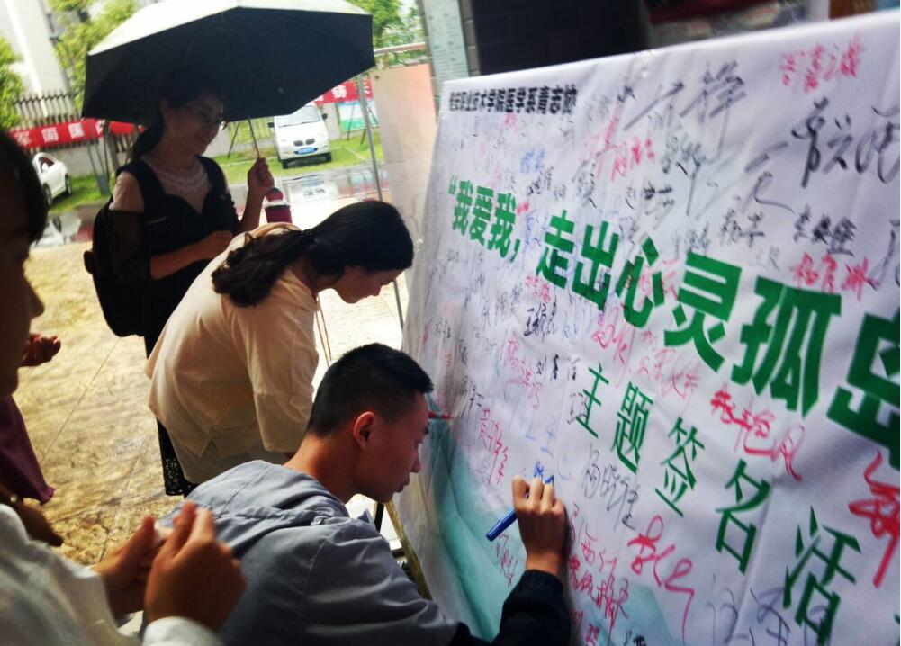 【本网讯】为关注大学生心理健康,积极营造有利于大学生心理健康发展的校园氛围,5月17日,医学系青志协副主席陈俊森携8名志愿者在实训与服务中心开展了“我爱我,走出心灵孤岛”主题签名活动。