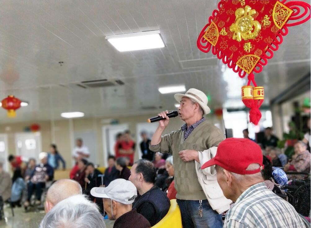 志愿者们帮助老人们陆续在大厅入坐后,活动在热情似火的开场舞《火塘边上的嘟噜哩》中拉开帷幕。志愿者们陆续表演了合唱《歌唱祖国》、《外婆的澎湖湾》、《一路上有你》、《月亮代表我的心》、《我只在乎你》,诗朗诵《祝福》等节目,老人们掌声连连,欢声笑语。志愿者们还邀请老人们参与到活动中来,他们主动唱起了《没有共产党就没有新中国》、《南泥湾》等歌曲,更有陪同的护工叔叔高歌一曲《映山红》,在他们那充满慷慨激昂的歌声里,现场的氛围轻松愉悦而又热闹,大家的脸上都绽放着开心的笑颜。