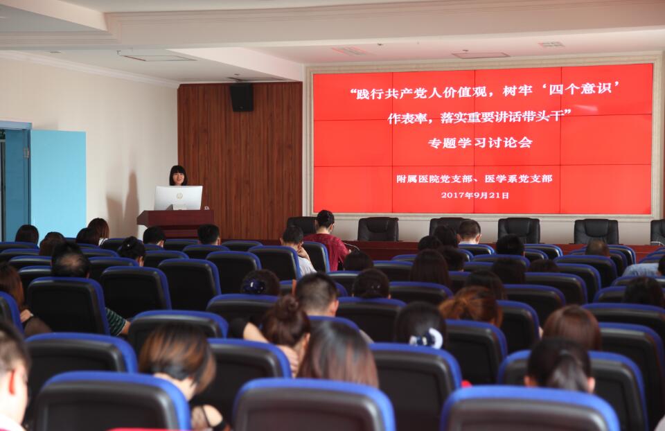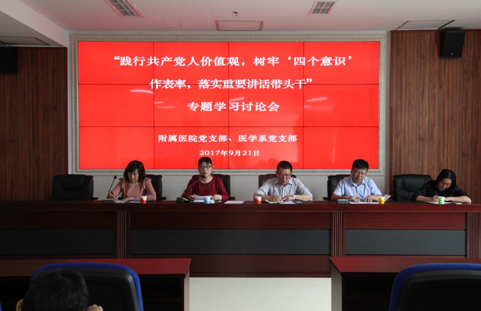 【本网讯】附属医院、医学系党支部开展“践行共产党人价值观,树牢‘四个意识’作表率,落实重要讲话带头干”专题学习讨论会