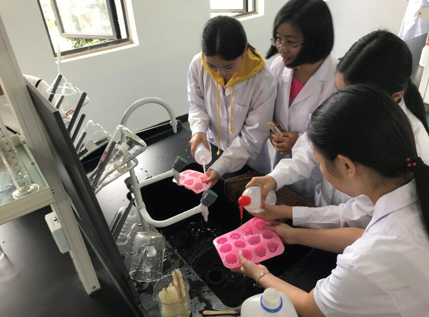 由于实验室的容纳量限制,每个班级只推选了1-2名同学参加,共计40余人参加。同学们在老师的指导下,按照步骤称量材料、融合搅拌,放入不同功效、不同味道的精油、花草等添加物。然后根据自己的喜好选择形状各异的模具,并将搅拌好的皂液倒入模具中静置冷却。不一会儿,精美的手工皂就诞生了。