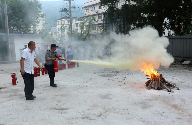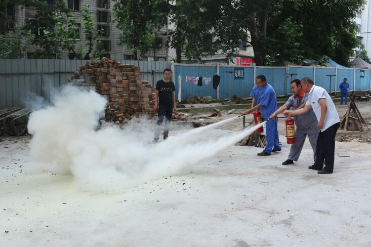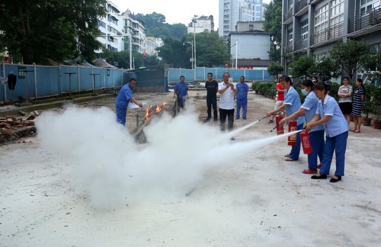 现场模拟演练中,重点培训了各临床科室医护人员、物业公司电工和保安保洁人员如何正确使用灭火器,并进行了持灭火器实操演练灭火。