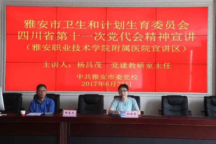 【本网讯】为更好学习、宣传、贯彻四川省第十一次党代会精神,根据《中共雅安市卫计委委员会关于开展学习贯彻省第十一次党代会精神宣讲工作的通知》要求,beat365在线唯一官网附属医院于2017年6月27日下午在门诊大楼十楼学术厅举行省第十一次党代会精神宣讲会。市委宣讲团成员、市委党校党建教研室主任杨昌茂副教授主讲,附属医院及医学系党员师生共110余人参加了此次宣讲会。会议由附属医院、医学系党支部书记祝继英主持。