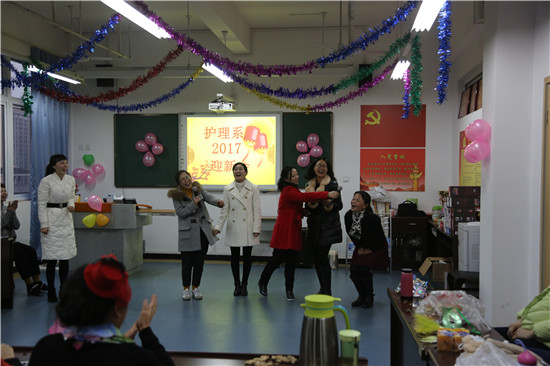 【本网讯】12月28日下午,护理系迎接新年化妆舞会在实训楼607隆重举行。舞会由闵捷、谢琳娜主持,全系教职工欢聚在此庆祝新年的到来。