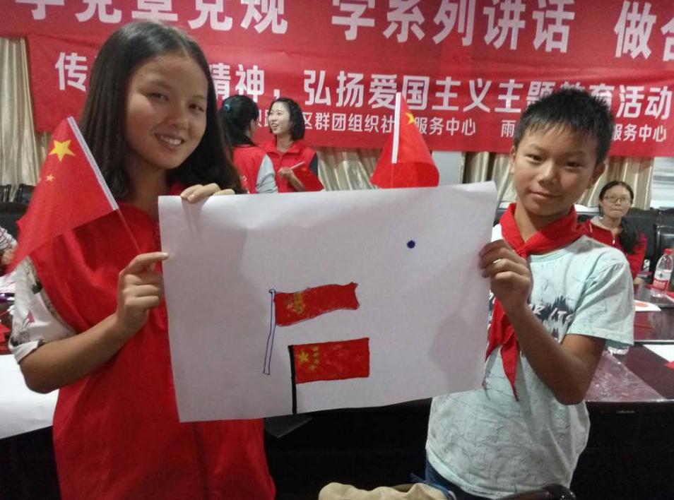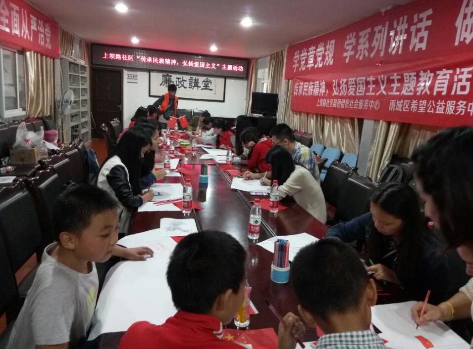 【本网讯】9月29日,在迎接国庆67周年到来之际,教育系王惠瑶、何丹黎、颜萌等数10名志愿者参加了由雨城区希望公益服务中心在上坝路社区举办的爱国主义教育主题活动,参加本次活动的还有来自雨城区各个小学的40名学生。