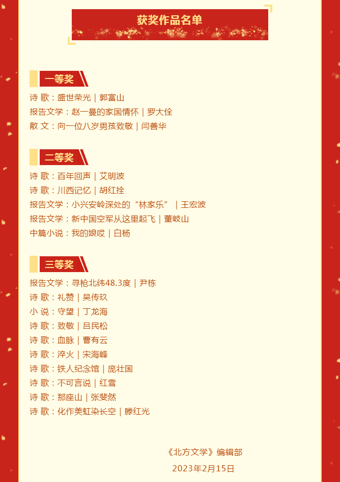 本次主题征文活动由中共黑龙江省委奋斗杂志社部署,《北方文学》编辑部举办,共收到诗歌、小说、散文、评论、报告文学等3781篇(首),最终评选出18篇优秀作品,分获第一二三等奖。