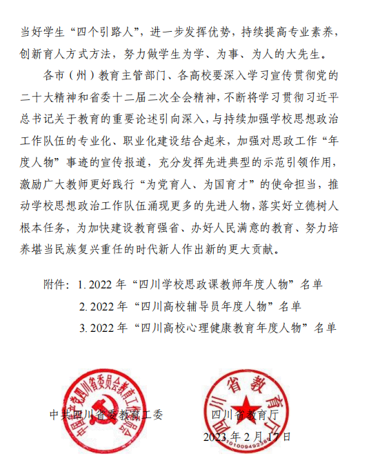 近日,中共四川省委教育工委、四川省教育厅公布了2022 年思政工作“年度人物”评选结果。学院教师王坤容入围“四川学校思政课教师年度人物”,教师张晓惜入围“四川高校辅导员年度人物”,教师王可晖入围“四川高校心理健康教育年度人物”。