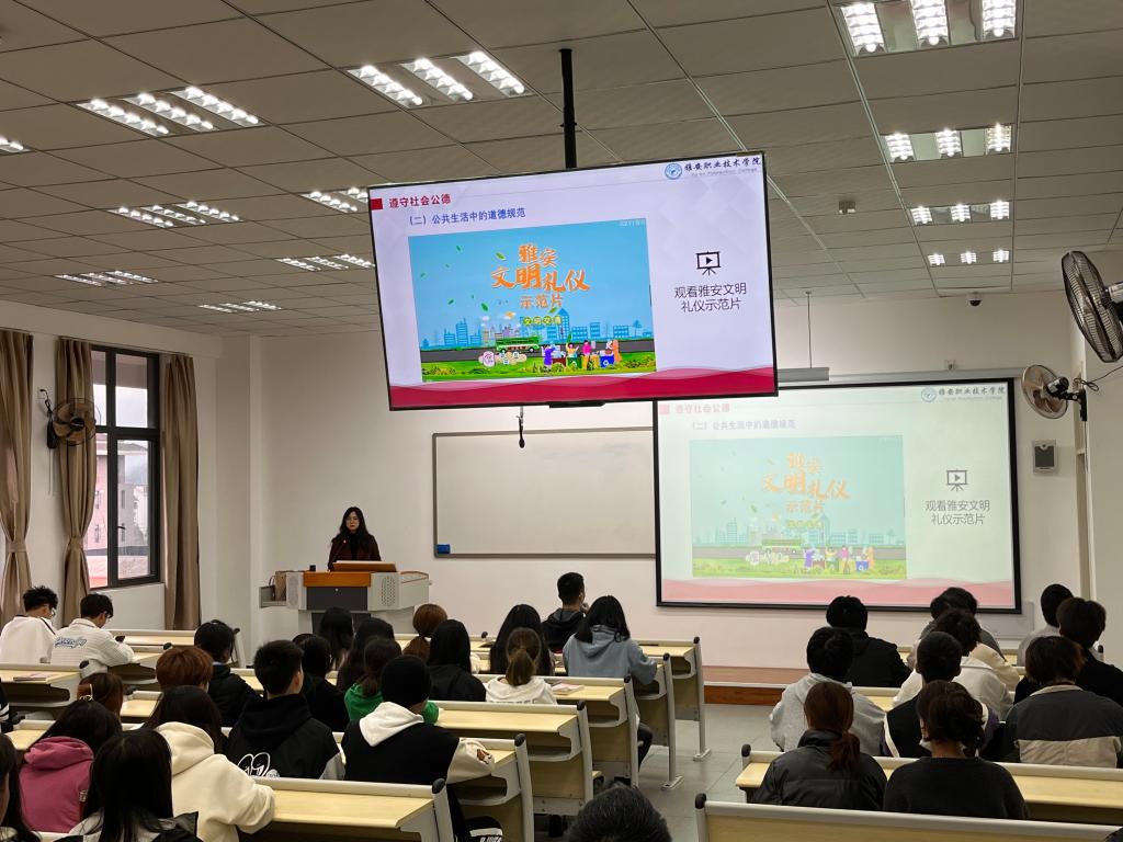马克思主义学院充分发挥思政课主渠道主阵地作用,以开设《思想道德与法治》《职业道德与法治》课程的学生为重点群体,聚焦“德法兼修涵养文明 青春助力绿色发展示范市建设”,挖掘新时代文明实践鲜活案例,将“雅安创建全国文明城市宣传片”“雅安文明礼仪示范片”作为教学资源融入课堂教学,引导学生明大德、守公德、严私德,切实做文明建设的宣传者、实践者、引领者。