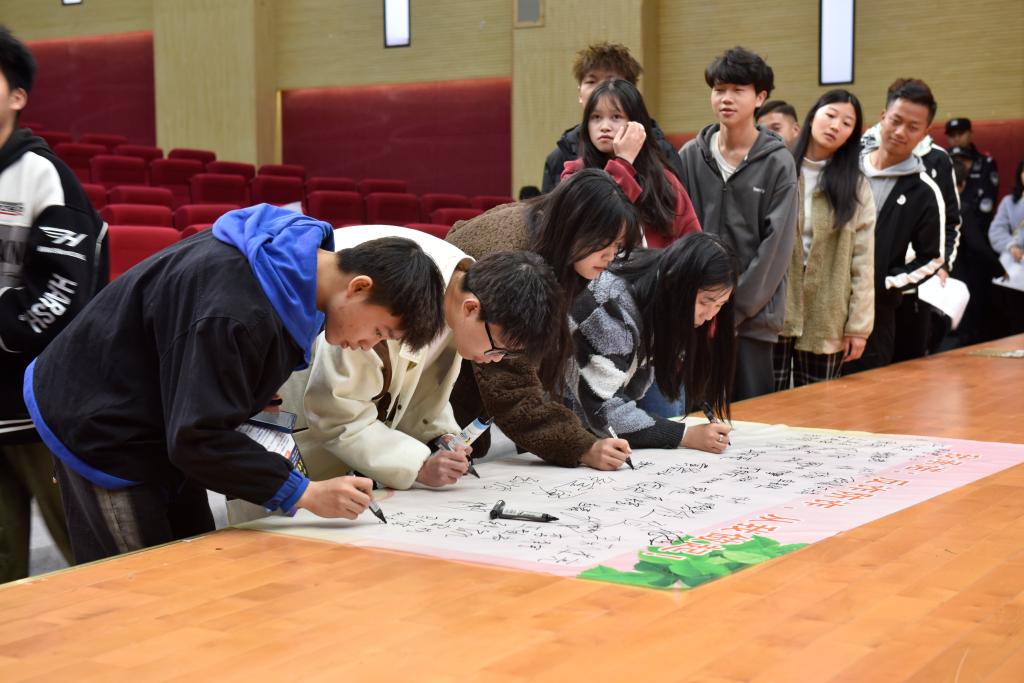 审判结束后,主审法官对帮助信息网络犯罪活动罪的法律规定、常见犯罪形式、法律后果进行了宣讲,重点针对为了蝇头小利将银行卡出售、出租、出借给不法分子进行“跑分”的方式进行详细介绍,结合审判实务的典型案例,提醒学院学生要树立正确的价值观、交友观、消费观,自觉同电信诈骗及关联犯罪做斗争。宣讲结束后,主审法官带领学生庄严宣誓:反诈防诈,从我做起。为使抵制犯罪从自身做起的意识根植于学生内心,学生们在横幅上郑重签名。