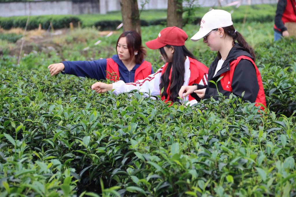 实践活动开始前,茶园负责人为同学们讲解了采茶技巧,传授了分辨茶叶的方法和选取采摘茶叶的标准,并向同学们示范正确的采茶步骤。师生在茶园负责人的指导实践后,开始了热火朝天的采茶活动。师生化身“茶农”,身披红马甲、腰挂藤箩筐,严格采摘标准,在一排排茶树丛间穿梭,认真地分辩和挑选“单芽叶”“一芽一叶”,采摘动作从生疏到熟练。