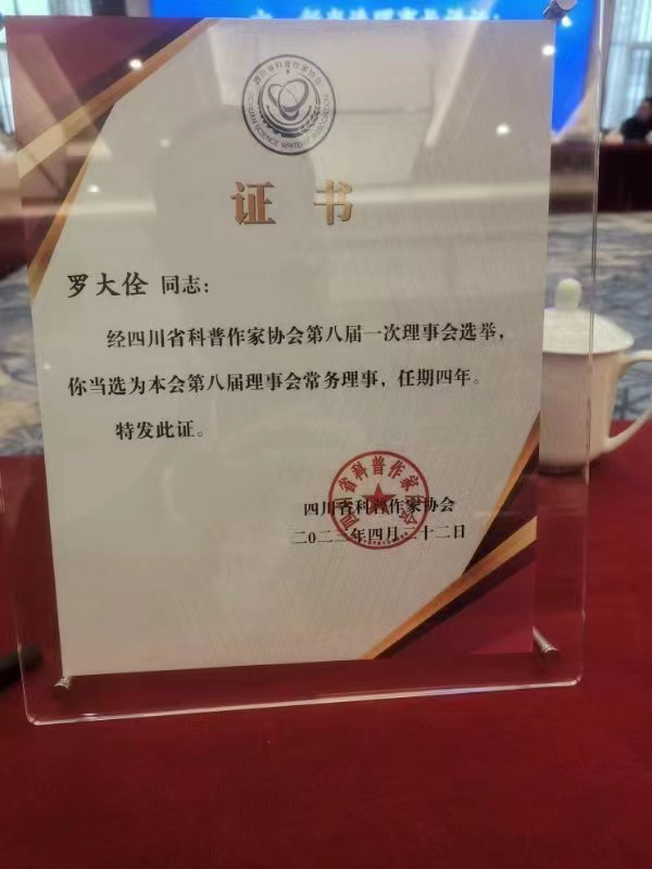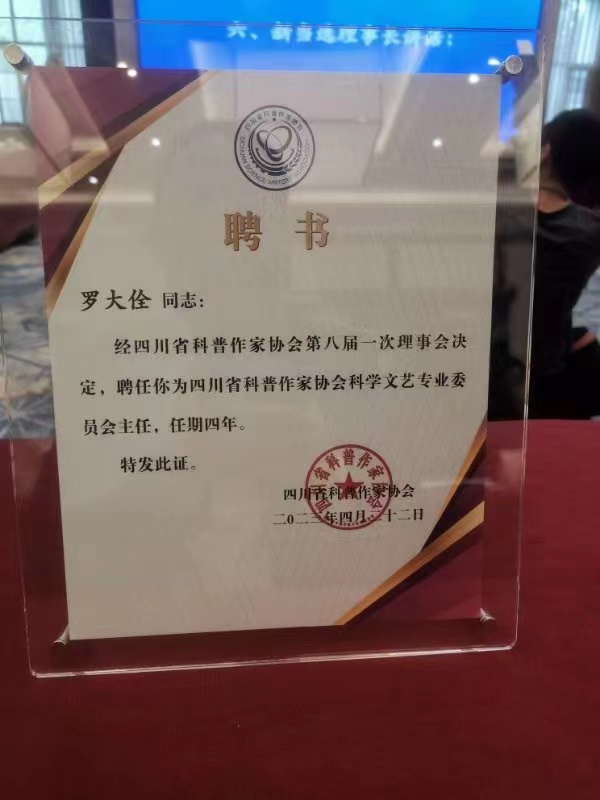 4月22日在成都新华宾馆召开的四川省科普作家协会第八次会员代表大会上,学院教师、工会副主席罗大佺当选八届理事会“常务理事”,并被聘为“科学文艺专委会主任”。
