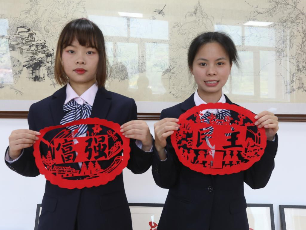学生在郭靓薇的带领下运用剪纸技术剪出了社会主义核心价值观、剪纸披肩和窗花等各类手工艺术品,学生手法略显生疏但积极性高涨。