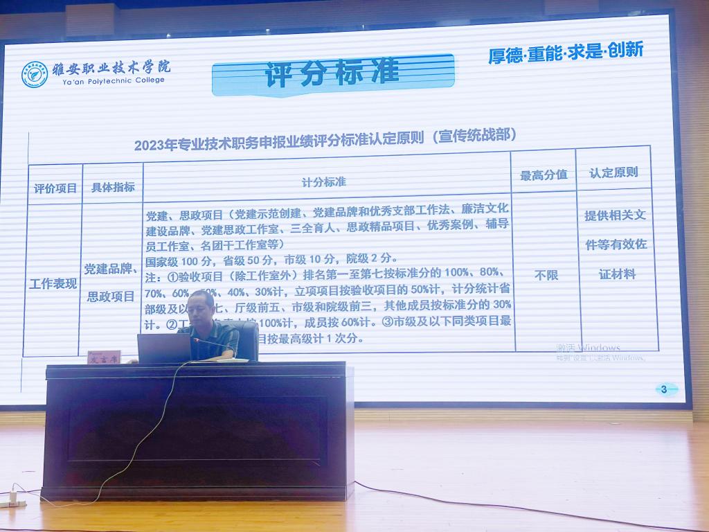 组织部副部长、人事处副处长杨梅专题解读了2023年学院印发的《职称评审办法》,对职称申报、评审、管理中的有关重点事项进行了着重说明。组织人事处、宣传统战部、教务处、科技图书情报处等9个职评办成员部门分别对业绩类型、认定标准、认定原则等做了现场培训。