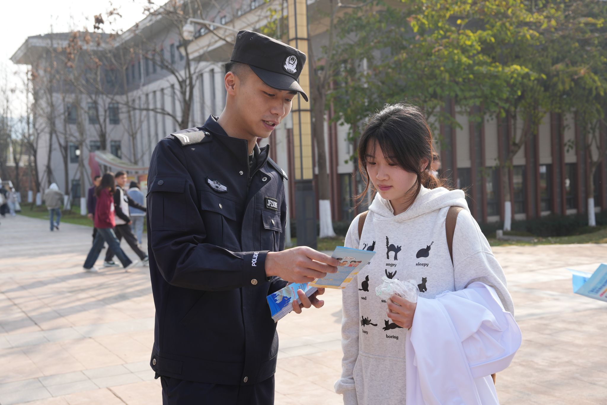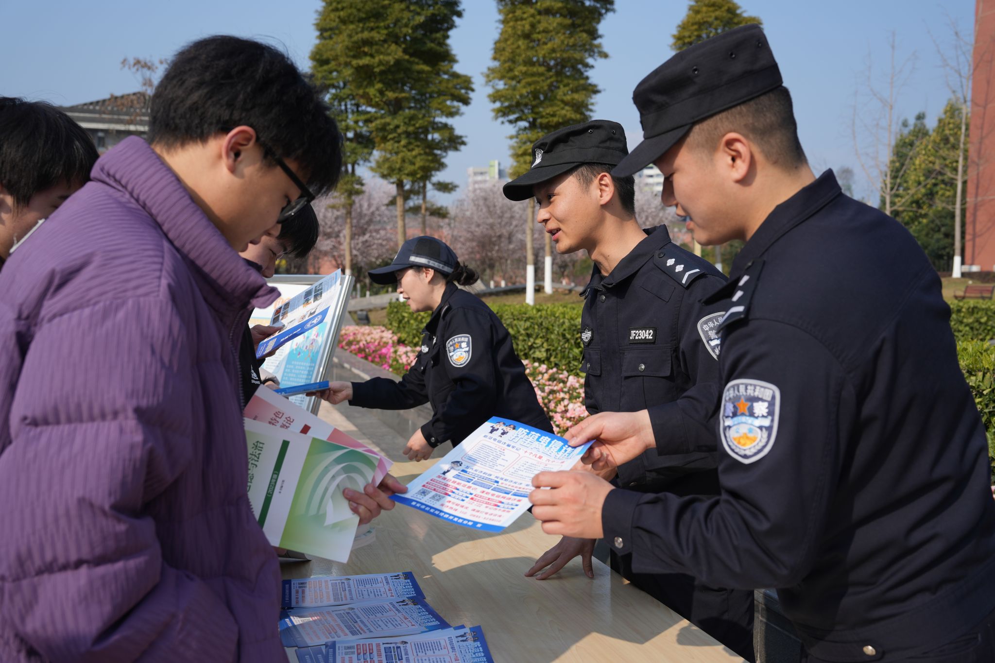 学院宣传统战部的工作人员和公安民警一起向师生发放了图文并茂的宣传手册,直观地展示了网络谣言、网络诈骗以及毒品问题的严重性和危害性。
