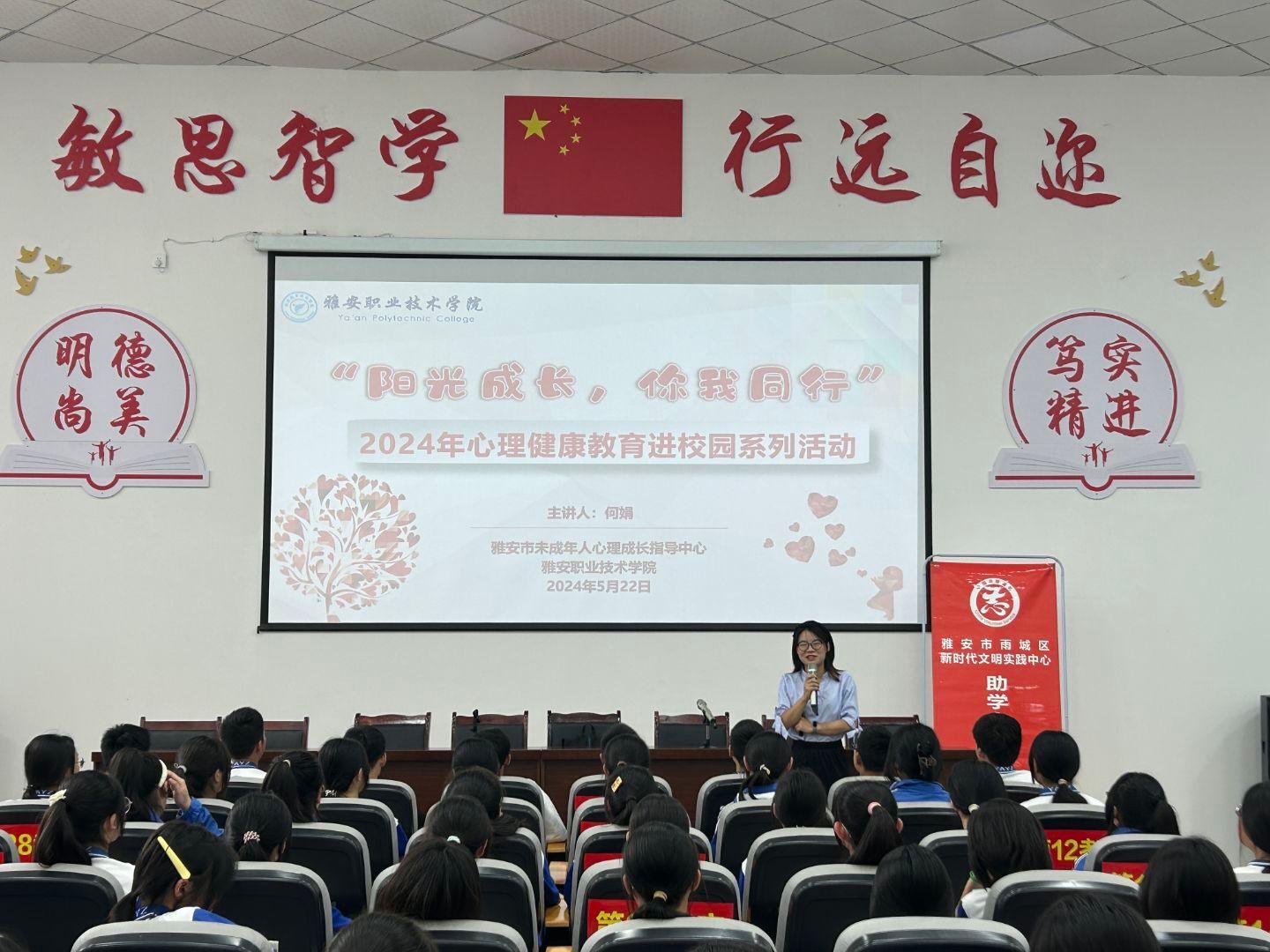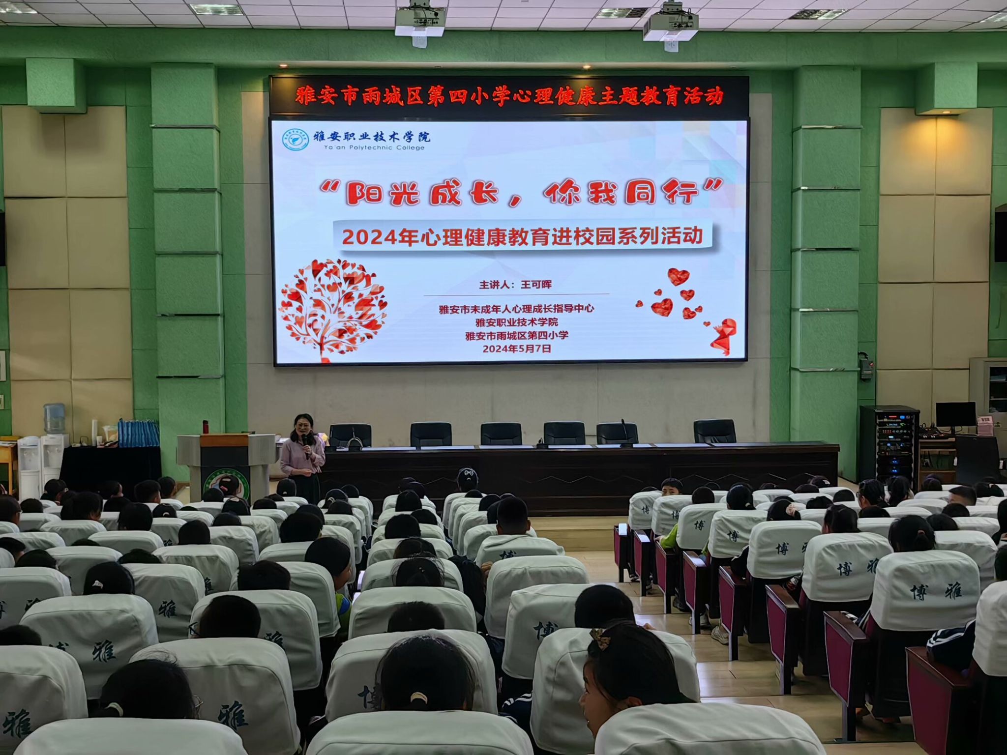 为落实教育部《全面加强和改进 新时代学生心理健康工作专项行动计划(2023-2025年)》及省教育厅《四川省全面加强和改进新时代学生心理健康工作实施方案》等相关要求,扎实推进全市未成年人心理健康教育工作,提升青少年心理素养,培养德智体美劳全面发展的时代新人,2024年3月-5月,学校王可晖、王丽等9名专兼职心理教师,依托雅安市未成年人心理成长指导中心,在全市开展“阳光成长,你我同行”心理健康教育进校园系列活动,赴雅安市雨城区兴贤小学、田家炳中学、名山区蒙顶山实验小学等10余所中小学校,开展心理健康教育专题讲座、团体辅导活动16场,2700余名中小学生参与活动。