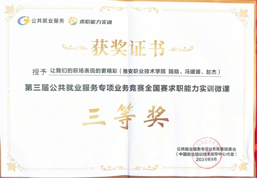 今年9月,第三届公共就业服务专项业务竞赛全国赛在四川省宜宾市成功举办,beat365陆晗、冯媛媛、赵杰教师团队的《让我们的职场表现的更精彩》微课作品在求职能力实训微课赛道中荣获三等奖。