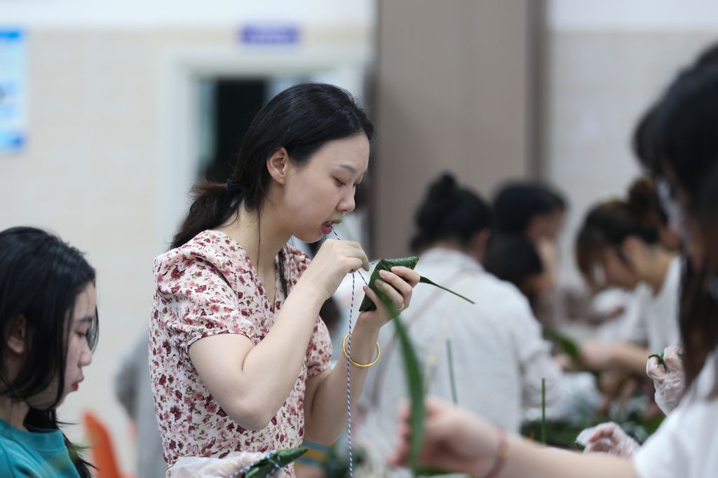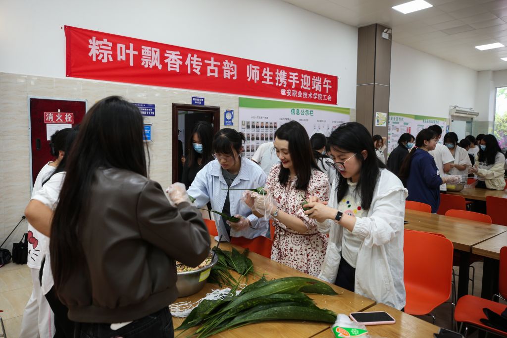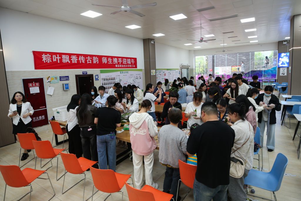 活动现场,粽叶飘香,气氛热烈。师生代表齐聚一堂、各显身手包粽子。活动得到后勤基建处的大力支持,食堂师傅提前准备好了粽叶、糯米、馅料等食材,老师和同学根据口味喜好调味、拌料。新手们围在经验丰富老师身旁学习请教,热心的能干人则手把手教学,在欢声笑语中,大家一边认真学习包粽子的动作要领、一边感受着端午节的独特氛围。活动中,师生们还自发地开展比速度、比工艺、比外形美观等小游戏,更增添了活动的趣味性。