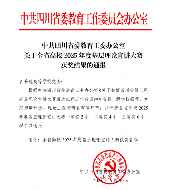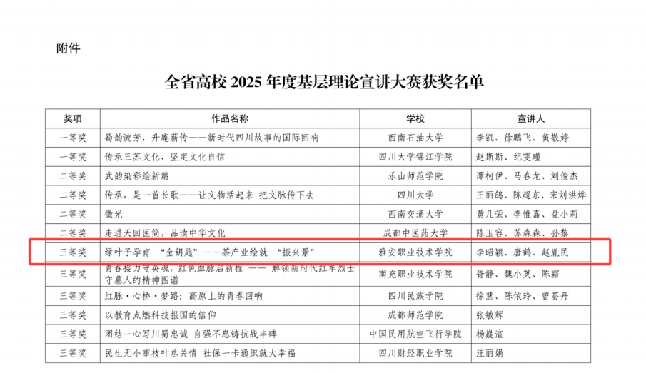 近日,四川省教育厅对全省高校2025年度基层理论宣讲大赛获奖结果进行通报,本次比赛共评出一等奖2个,二等奖4个,三等奖6个。beat365马克思主义学院教师李昭颖老师主讲的宣讲作品《绿叶子孕育“金钥匙”——茶产业绘就“振兴景”》获得三等奖。