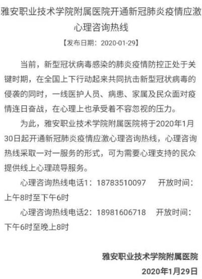 并于29日起,作为雅安市首家医院开通新型冠状病毒肺炎疫情应激心理咨询热线,采取一对一服务形式,为需要心理支持的民众提供线上心理疏导服务。