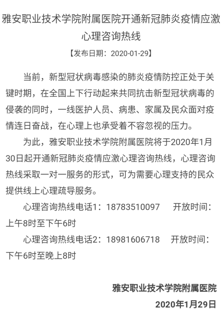 值得的一提是,雅职院附属医院于今日(1月30日)起,作为雅安市首家医院开通新型冠状病毒肺炎疫情应激心理咨询热线,采取一对一服务形式,为需要心理支持的民众提供线上心理疏导服务。