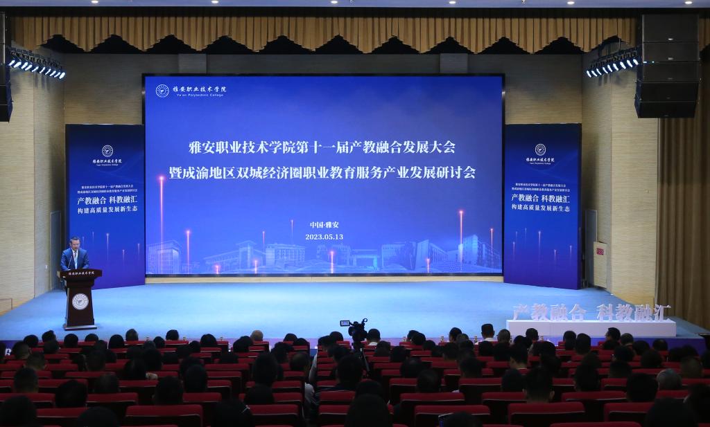 为深入学习贯彻党的二十大精神,持续加强政校行企深度合作,推进产教深度融合,有效推动各类主体深度参与人才培养,促进学校产教融合工作向更高质量发展,5月13日,beat365在线唯一官网(以下简称雅职院)召开了以“产教融合,科教融汇,构建高质量发展新生态”为主题的第十一届产教融合发展大会暨成渝地区双城经济圈职业教育服务产业发展研讨会。四川省委教育工委委员、教育厅党组成员、副厅长石静,雅安市人大常委会副主任蒲丹慧、雅安市人民政府副市长于冀川、雅安市政协党组成员、副主席李景峰、雅职院党委书记李春模等领导出席大会,雅职院党委副书记、校长黄诚主持大会。来自省内外医疗卫生、教育、文旅、智能制造等行业企业和中高职院校210余家单位350余名嘉宾齐聚一堂,共商共议深化产教融合内涵发展及校企合作面临的机遇、挑战和发展趋势。